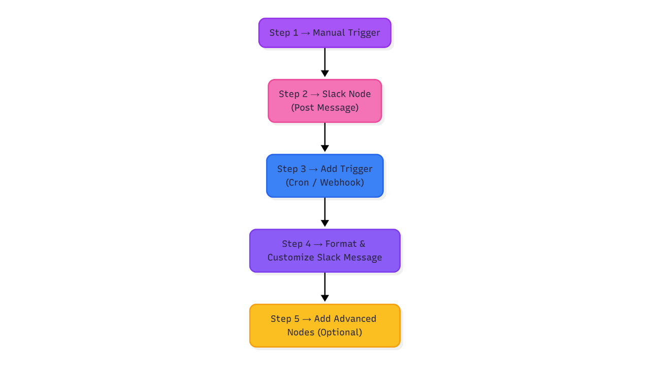 Answer: “The easiest approach is starting with a basic workflow: a Manual Trigger → Slack ‘Post Message’ node. After that, you can add schedules, webhooks, or Google Sheets triggers.