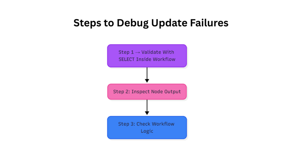 Steps to debug n8n PostgreSQL update failures using SELECT validation, node output inspection, and workflow logic checks